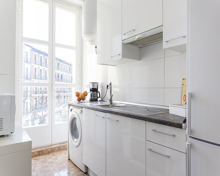 Cozy and bright south facing apartment, new and furnished with modern furniture, located on a quiet street behind Plaza Mayor and just around the corner from Puerta del Sol and Plaza Santa Ana. Sunny lounge with 42" TV and balcony, bright bedroom with air conditioning, new fully equipped kitchen with balcony and washing machine.