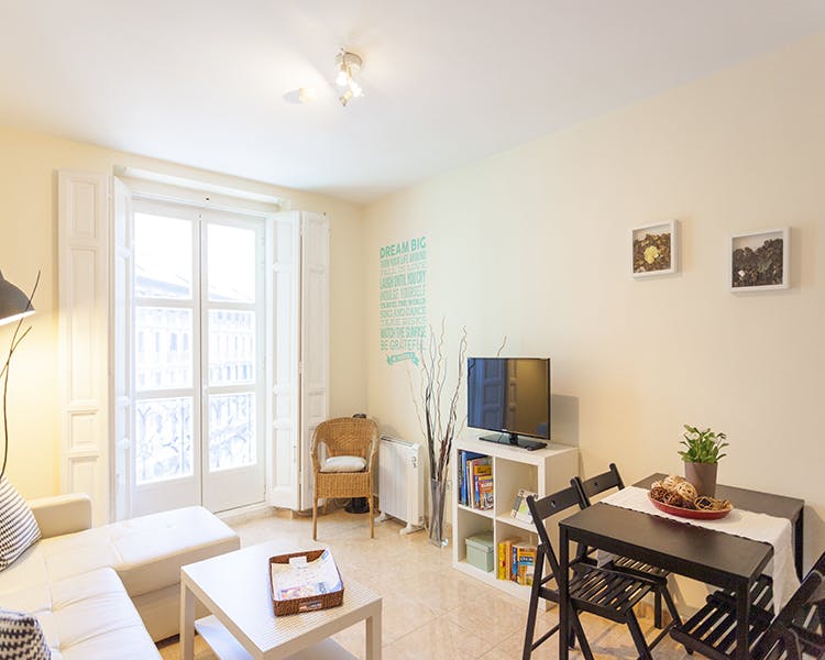 Cozy and bright south facing apartment, new and furnished with modern furniture, located on a quiet street behind Plaza Mayor and just around the corner from Puerta del Sol and Plaza Santa Ana. Sunny lounge with 42" TV and balcony, bright bedroom with air conditioning, new fully equipped kitchen with balcony and washing machine.